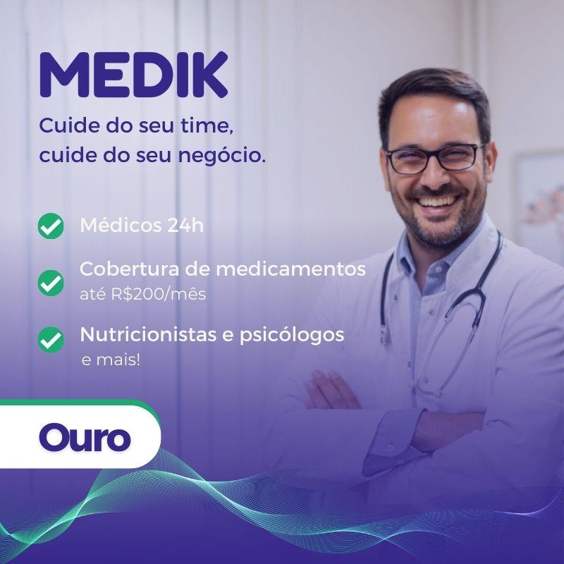 CONHEÇA O BENEFÍCIO MEDIK O benefício MEDIK é uma solução eficiente e inovadora de proteção à saúde, viabilizando o cuidado com o bem estar físico e mental da sua equipe de forma muito mais econômica e acessível se comparado aos modelos tradicionais. Um time saudável está preparado para lidar de forma eficaz com o estresse e pressão do dia a dia, aumentando os índices de produtividade, motivação, engajamento e, inclusive, reduzindo as taxas de faltas e atrasos. Assim, entregamos saúde com foco na redução do absenteísmo, presenteísmo e rotatividade dentro das empresas. O nosso conjunto de serviços está disponível de forma simples e 100% remota, permitindo o acesso rápido, a qualquer momento e de qualquer lugar. Os atendimentos são ilimitados e sem a possibilidade de custos adicionais. Com MEDIK, sua equipe se sente acolhida e valorizada em um ambiente de trabalho que investe no bem estar de todos! NOSSOS SERVIÇOS - PACOTE OURO Médicos 24h via telemedicina Cobertura de Medicamentos Genéricos até R$200,00/mês em +15.000 farmácias credenciadas Psicólogos, Nutricionistas, Educadores Físicos, Farmacêuticos e Assistentes Sociais disponíveis via teleatendimento Comece agora a cuidar do seu time e do seu negócio de forma tranquila, ágil e segura com MEDIK!