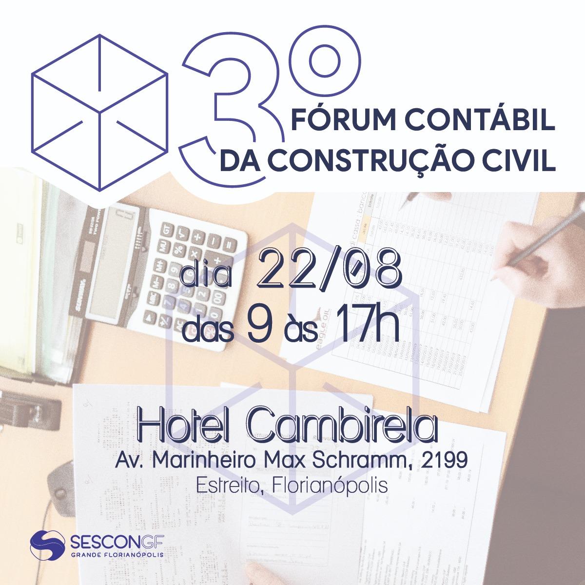 Objetivo: O 3º Fórum Contábil da Construção Civil surgiu da necessidade de continuarmos o trabalho iniciado em 2014 quando aconteceu o 1º Fórum e abrangeu um publico de mais de 100 participantes, trazendo aperfeiçoamento profissional para os contadores de Florianópolis e região. O evento será inédito na região no ano de 2023 que contará com a participação de profissionais renomados a nível nacional e que abordarão importantes temas do setor. Público-alvo: O aperfeiçoamento do profissional (empresários e contadores) que atua direta ou indiretamente com a construção civil. Carga Horária: 8h Próxima turma: Dia 22/08 das 9h às 17h No Hotel Cambirela Conteúdo Programático: • Situação do cenário econômico Estadual e Nacional; • Tributação e contabilidade; • Regularização de obras; • Os impactos do eSocial, EFD-Reinf e SERO na Construção Civil;