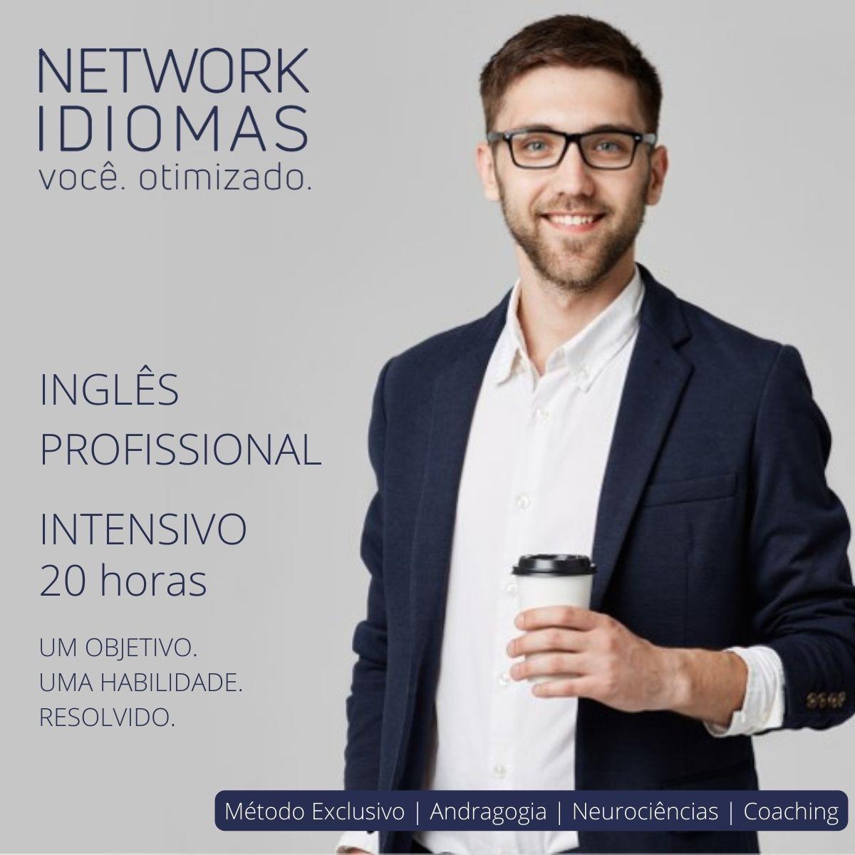 ESTE PRODUTO É UM PACOTE DE HORAS QUE INCLUI 20 HORAS DE TREINAMENTO. - As datas e horários específicos de cada sessão e sua duração serão determinados com a coordenação, após a contratação. PARA QUEM É ESTE TREINAMENTO? Este treinamento é destinado aos profissionais que necessitam realizar uma tarefa específica no idioma inglês, seja somente por escrito ou somente oralmente. REQUISITOS DO TREINAMENTO: NÃO É NECESSÁRIO CONHECIMENTO PRÉVIO DE INGLÊS. Mas você precisa preencher 2 REQUISITOS CUMULATIVOS para que este treinamento seja adequado para você: REQUISITO 1. ter um desafio em inglês que seja ESPECÍFICO E DELIMITADO: - exemplo: uma apresentação específica, uma entrevista para um determinado emprego, uma call sobre determinado produto, passar numa prova de proficiência específica. - não são casos para este treinamento: viagem de negócios em geral, negociações de contratos, ligações em geral. E, AINDA, CUMULATIVAMENTE REQUISITO 2. esse desafio tem que ser EXECUTADO TOTALMENTE A) OU SOMENTE FALADO; OU B) OU SOMENTE ESCRITO! - em 20h, somente conseguimos gerar um tipo de correção e aperfeiçoamento. QUEM SOMOS A NETWORK IDIOMAS - você. otimizado. assegura grau de qualidade que possibilita seu resultado definitivo, com uma METODOLOGIA EXCLUSIVA E PRÓPRIA, baseada em ANDRAGOGIA, NEUROCIÊNCIAS e ferramentas de COACHING. Específica para adultos. Específica para o ambiente profissional. SUAS VANTAGENS NA CONTRATAÇÃO: Aqui na CONTABILSTORE, a NETWORK IDIOMAS tem ainda mais vantagens para você: - você ganha 15% de desconto como associado! - você ganha entrevista e avaliação GRATUITOS! - sem taxa de matrícula!