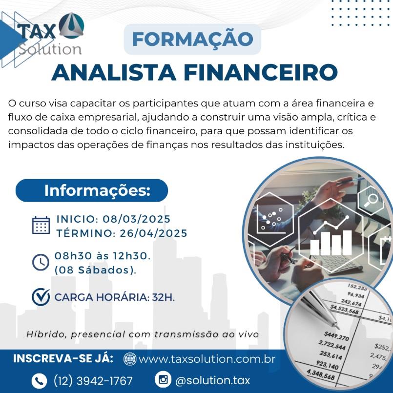 Treinamento de Analista Financeiro OBJETIVO Desenvolver participantes que atuam direta ou indiretamente com a área financeira e fluxo de caixa corporativo, auxiliando na construção de uma visão ampla, crítica e consolidada de todo o ciclo financeiro, para que possam identificar os impactos das operações financeiras nos resultados das instituições. A QUEM SE DESTINA? Pessoas que exercem funções relacionadas a atividades financeiras, ou que desejam desenvolver conhecimentos e habilidades necessárias ao desempenho. PROGRAMAÇÃO Datas: 08/03, 15/03, 22/03, 29/03, 05/04, 12/04, 19/04 e 26/04 de 2025 – (Sendo 8 sábados). Horário: 8h30 às 12h30 - Horário de trabalho : 32 horas. CONTEÚDO PROGRAMÁTICO Módulo 1 : Finanças Empresariais 1 – A função e a importância da área financeira para as empresas :
