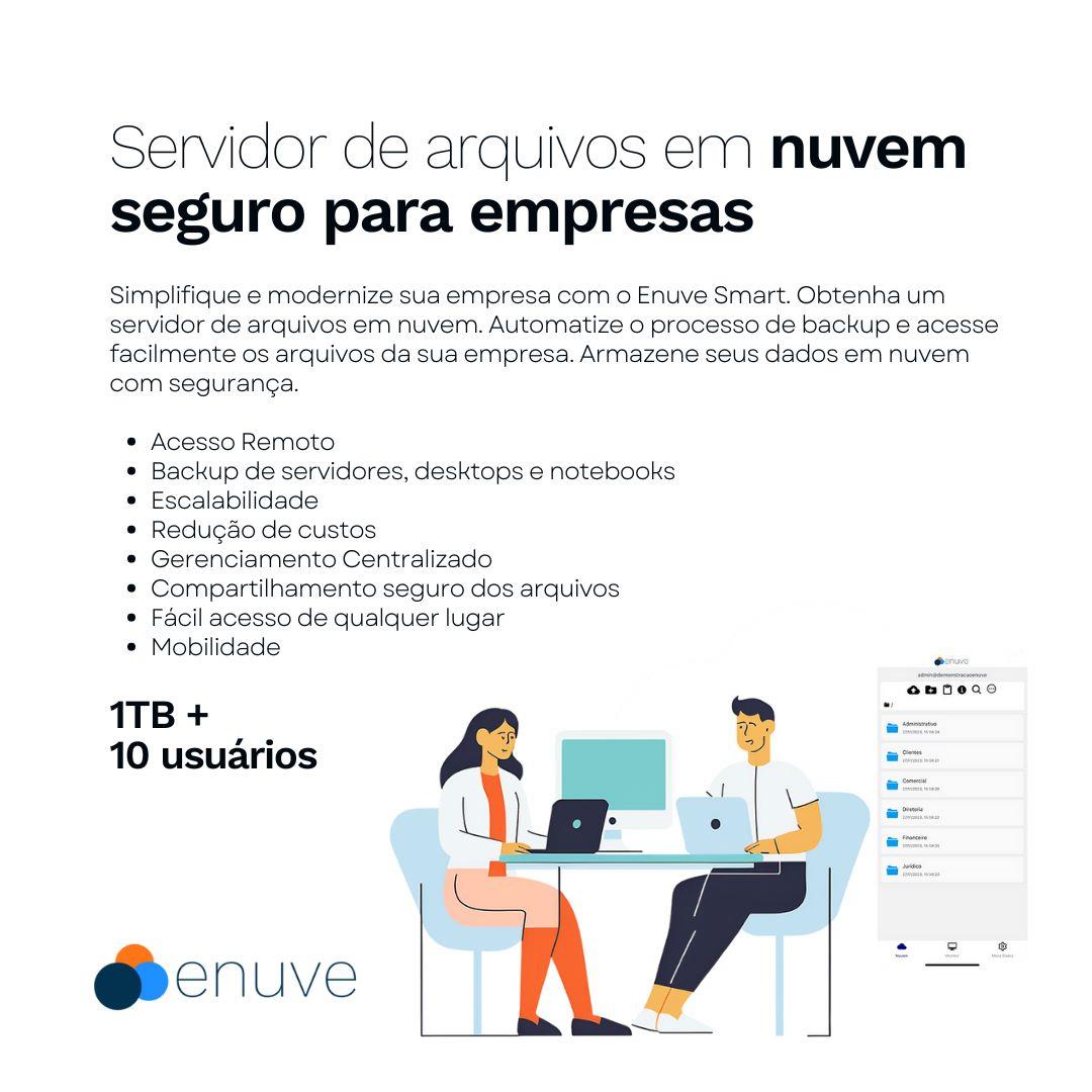 Servidor de Arquivos em Nuvem para Empresas Plano de 1TB + 10 usuários Obtenha toda a proteção de dados que você precisa em uma solução de backup em nuvem online. Backup automático em nuvem de servidores, desktops e notebooks da sua empresa. Possui criptografia militar AES 256 de ponta a ponta, além disso proporciona versionamento ilimitado das pastas, uma rápida recuperação e fácil gestão. Simples e seguro. Compartilhamento de arquivos que proporciona à você e sua equipe fácil acesso à todas as informações da empresa. Sempre obedecendo a política de acessos previamente configurada. Mobilidade através de acesso web e aplicativo, de qualquer lugar, hora e dispositivo. Principais benefícios para sua empresa: