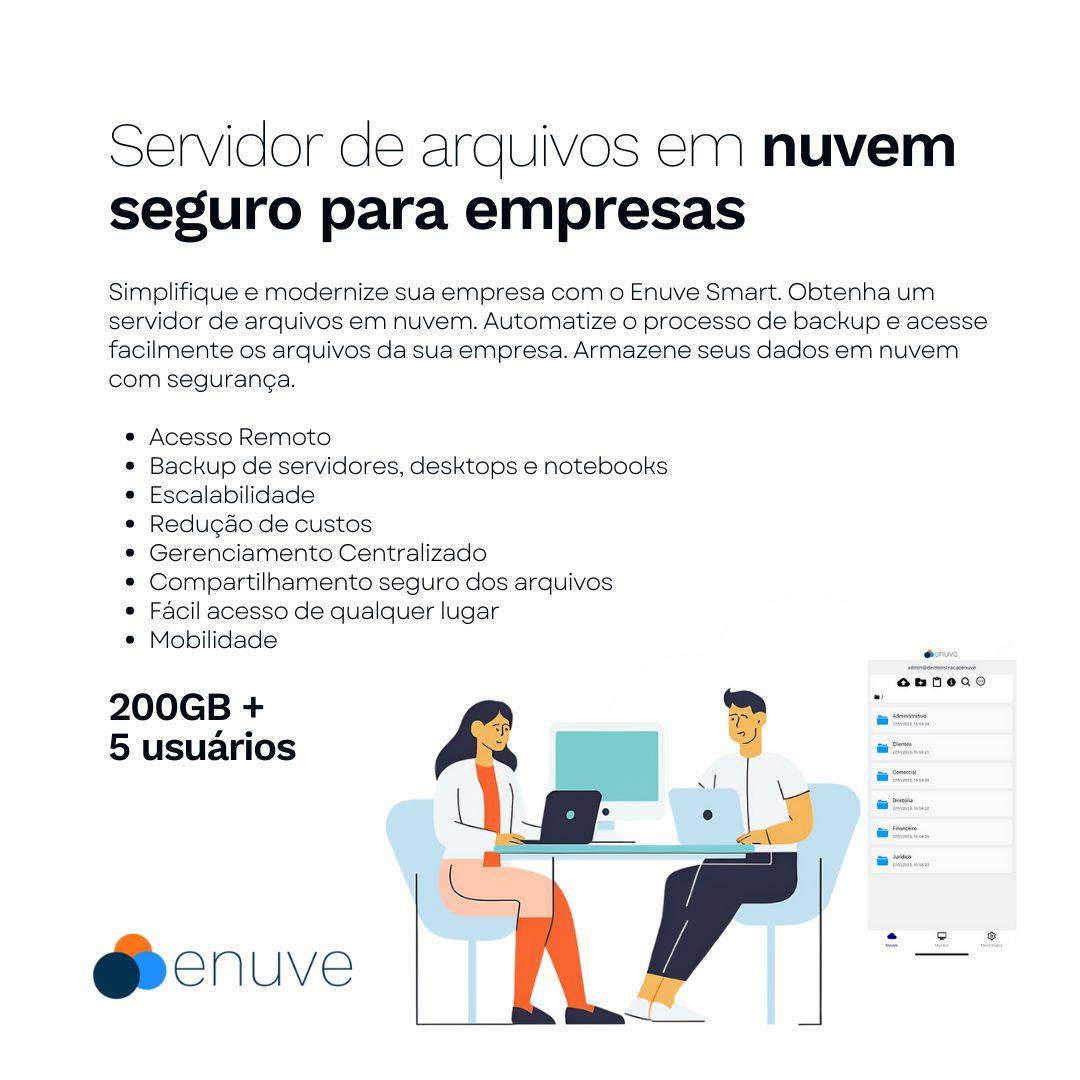 Servidor de Arquivos em Nuvem para Empresas Plano de 200GB + 5 usuários Obtenha toda a proteção de dados que você precisa em uma solução de backup em nuvem online. Backup automático em nuvem de servidores, desktops e notebooks da sua empresa. Possui criptografia militar AES 256 de ponta a ponta, além disso proporciona versionamento ilimitado das pastas, uma rápida recuperação e fácil gestão. Simples e seguro. Compartilhamento de arquivos que proporciona à você e sua equipe fácil acesso à todas as informações da empresa. Sempre obedecendo a política de acessos previamente configurada. Mobilidade através de acesso web e aplicativo, de qualquer lugar, hora e dispositivo. Principais benefícios para sua empresa: