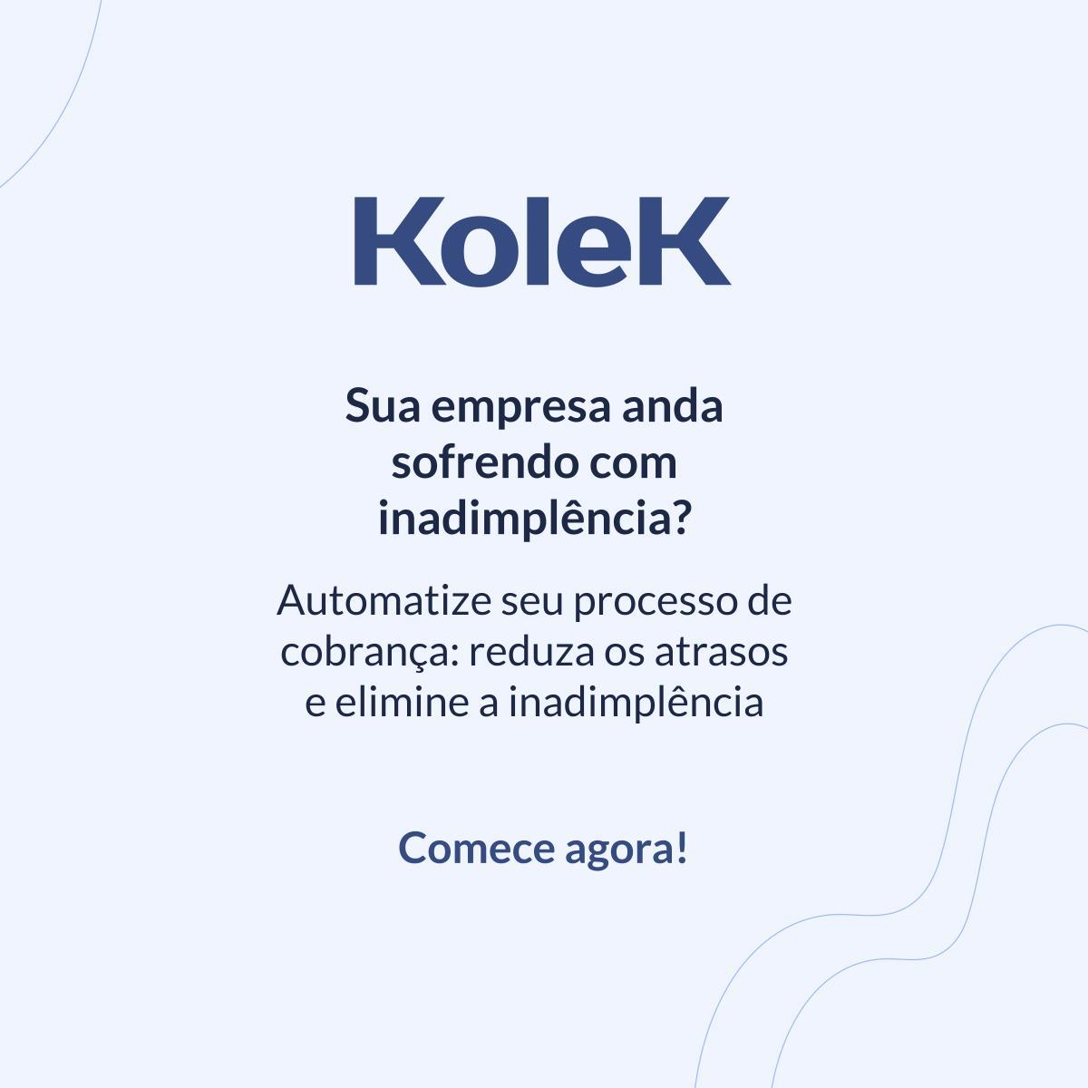 A Kolek é a solução que otimiza e automatiza as cobranças da sua empresa - prevenindo e remediando a inadimplência. Fazemos isso integrando dados do seu ERP/sistemas/planilhas e automatizando processos que hoje são altamente manuais. Aumentamos os pontos de contato e o engajamento com seu cliente, por meio de tecnologia, melhorando a experiência e reduzindo sua inadimplência! Já estamos integrados com o Omie e criando integrações com outros ERPs. Oferecemos suporte via telefone, Whatsapp e e-mail. Faturamento do software: diretamente pela Kolek Vencimento mensalidade: todo dia 10 de cada mês (proporcional ao tempo utilizado no mês) Reajuste (anual): IGPM Prazo contratual: mensal Prazo para cancelamento: 30 dias Prazo mínimo de contrato: não há